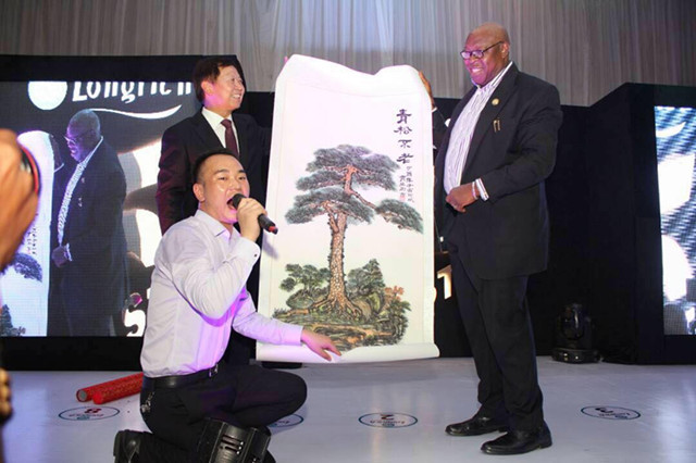 合影及贈(zèng)送隆力奇非洲區(qū)總經(jīng)理賈典畫像禮物