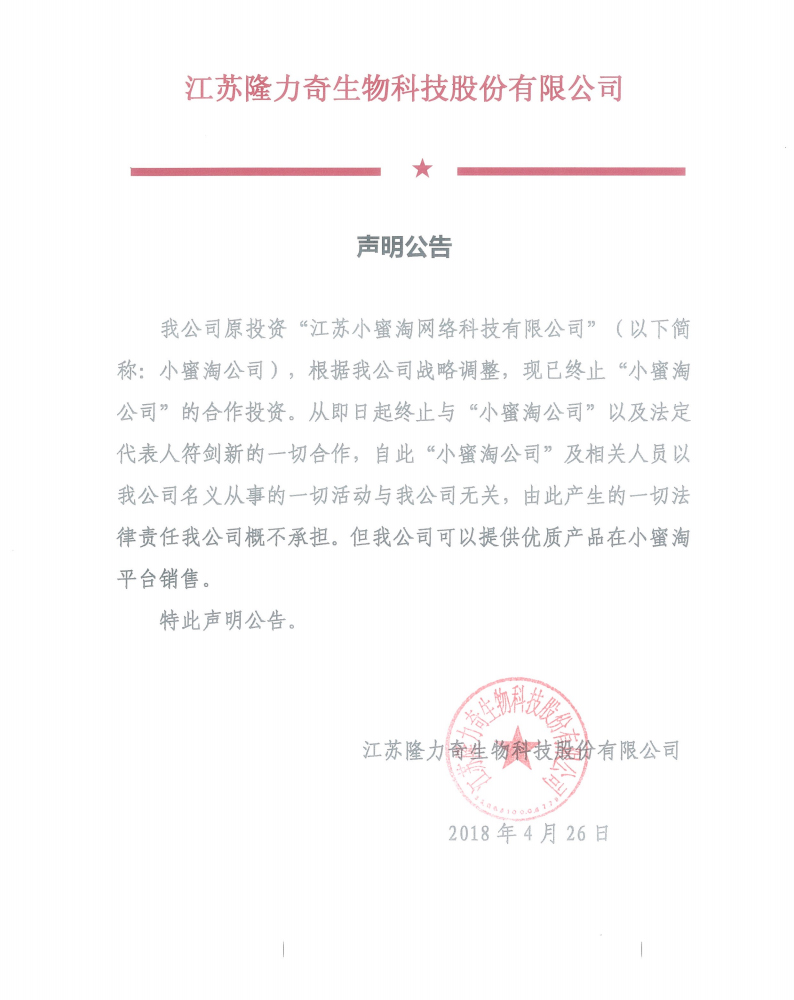 隆力奇生物科技股份有限公司聲明公告