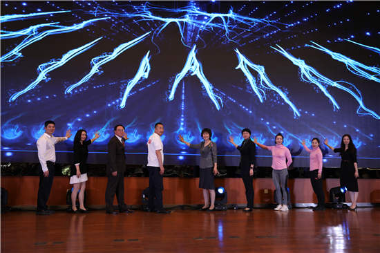 △徐之偉與蔚藍體育董事長陳蔚女士和世界冠軍楊伊琳(左二)、郭丹(左三)為瑜伽學院和健身瑜伽頻道揭牌
