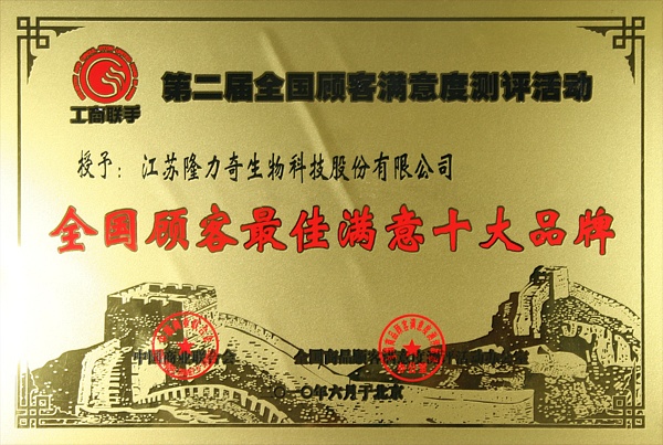 2010: The Company received the honorary title of 2009 Top 10 Most Satisfactory Brand by Chinese Consumers