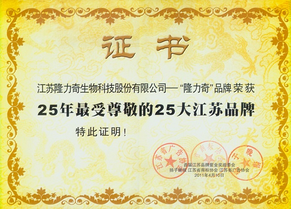 2011: Longrich received an honorary certificate for ‘’ 25 years Jiangsu Most Respected Brands ‘’