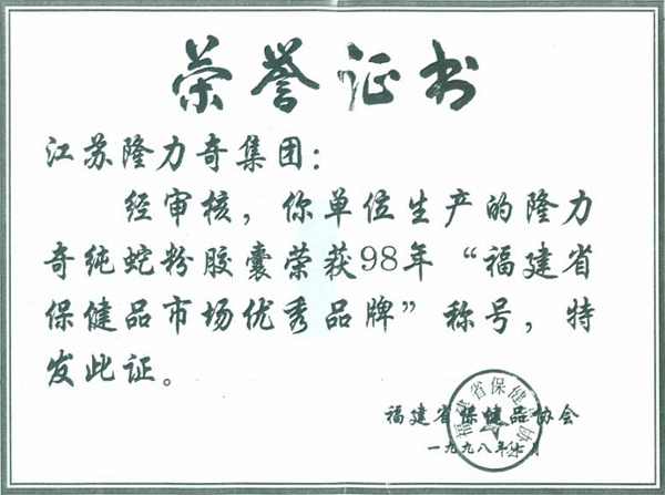 1998: Longliqi Snake Powder Capsule was designed as Outstanding Brand of Fujian Province Health Care Market.