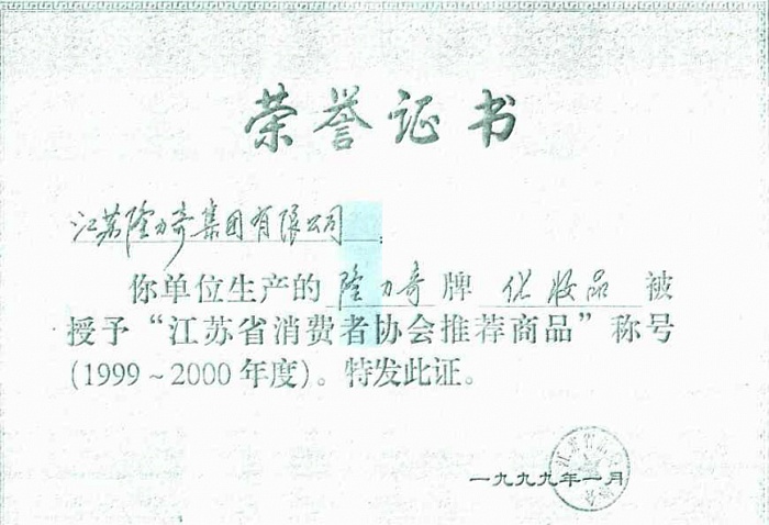 1999: Longliqi Pure Snake Powder was designed as ‘’ Recommended Commodities ’’ by the Consumers' Association of Jiangsu Province.