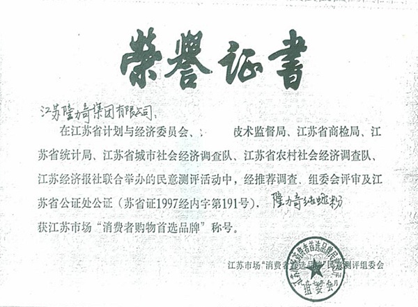 1997: Longliqi Snake Powder Capsule was designed as Consumers Preferred Brand of Jiangsu Market.