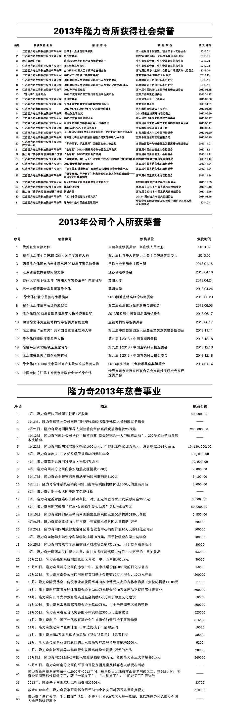 熱心公益慈善:公司發(fā)揮自身優(yōu)勢,明確公益重點(diǎn)領(lǐng)域,合理規(guī)劃公益活動(dòng),在助殘事業(yè)、社會(huì)慈善、教育事業(yè)等方面,以成立基金會(huì)的形式,保障愛心行動(dòng)的落實(shí)。2013年,公司的公益捐贈(zèng)累計(jì)達(dá)4241萬元。
