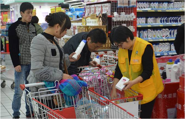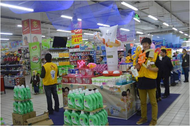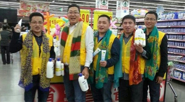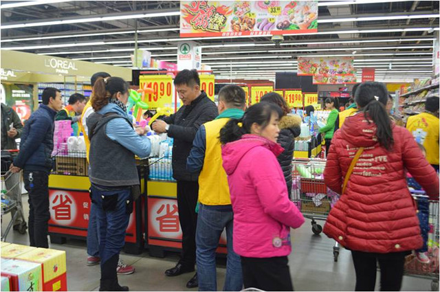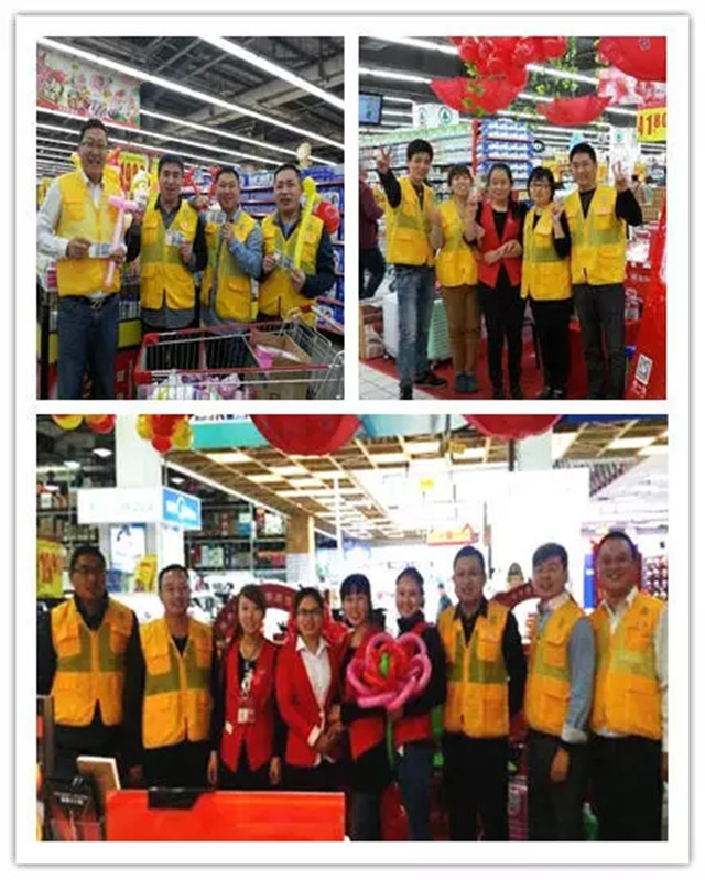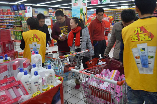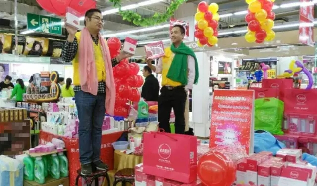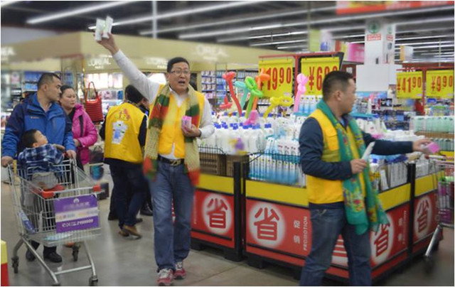 貨箱成為了踏板,手推車、購物籃演變成了道具,隆力奇銷售精英們或踩、或推、或拎,穿梭在日化區(qū)、樓梯道、蔬菜區(qū)、食品區(qū)、收銀區(qū)以及走道,儼然匯聚成了一片橙色的海洋。那都是穿著黃色馬甲的戰(zhàn)神們,為了品牌推廣,為了完成、沖刺銷售目標(biāo),進(jìn)行的爭分奪秒的連帶銷售,攔截潛在客戶,提升成交率,實現(xiàn)客單價最大化。